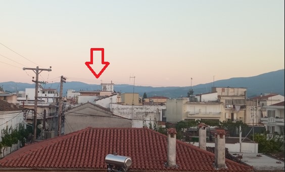 Here is the view from my roof. Where the arrow show there is a church cross which I used for calibration. Can’t really be seen from the pic, but it can be seen a bit with the eyes. We are focusing on the trees, in the top of the hill, way in the back.
