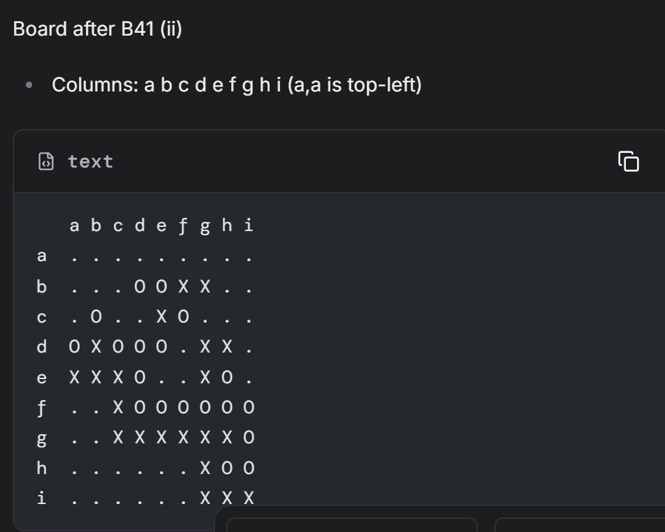 gpt-5 first ran into problems with just sgf snippet and not a formatted board at move 11, when I captured bD6, and it didnât register the D6 as captured, and then played E7 and called it âdouble atariâ. And when to ask it to recheck again, it first said no problem at all. And I asked it again to visualize with diagrams in every move. And then it started to post every diagram for every move till that point, and finally caught up the D6 âcapturedâ. Hence, I continue the game, asking it to visualize the diagram as well as keep adding a sgf snippet in each reply. And surprisingly, it was able to play ko for a couple of moves. However, it ran into trouble at move 32 again, when it thought it could play H6 to capture 4 white stones (I feel it treated the ko stone at D6 as alive), and I had to ask it to go back and check again for each stoneâs liberties and atari status, then it picked another move. It runs into trouble acknowledging C7 was captured after I played C8 at move 33, and I feel it ran into context limit at this point, and kept playing 1st line self-atari moves. Finally, at move 38, it thought H8 got captured, and kept trying to play H8, and couldnât update the board diagram, or the sgf snippet.