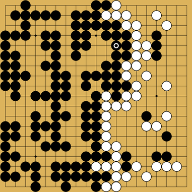The one-eye high liberty case continues to be the hardest to learn when the group is large. Value function very gradually changing in that case (depending on the size of the group, larger is harder to “perceive”), able now to detect this move as maybe letting black win, when a few weeks ago it wouldn’t consider black to have a large chance to win even after playing this cut.