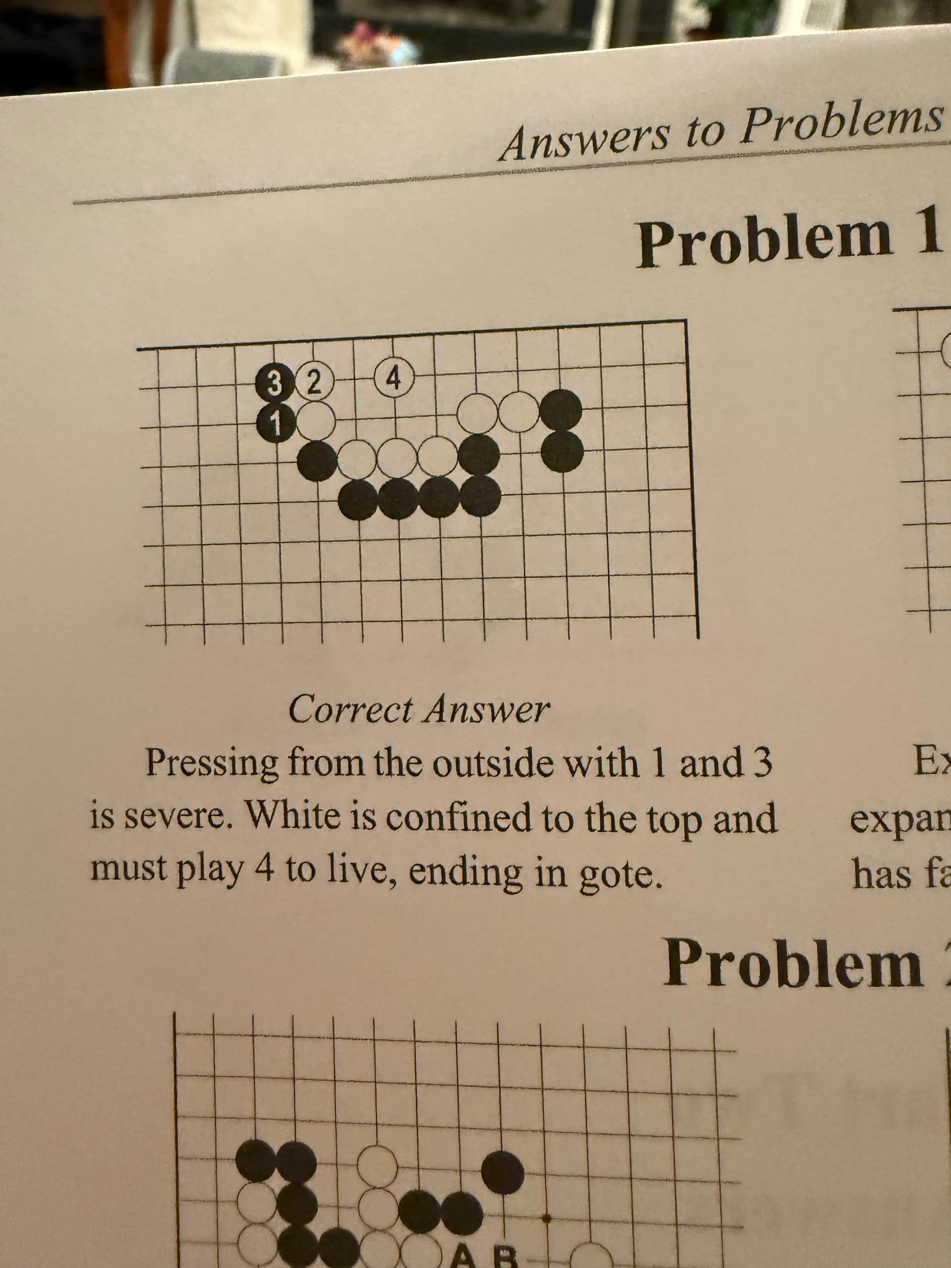 You definitely want to train your shape intuition to double hane at 1 here, that’s most important lesson. And then cover at 3 seeing the shape point attack at 4 inside next. But you are right to think about the cuts, and the explany words in the book about 4 gote are kinda wrong. White doesn’t absolutely need to defend at 4 to live, if they cut and extend like shinuoto’s 4th diagram then j19 being sente is enough to be (barely) alive. But this is a bit beyond the basic beginner shape lesson purpose of this problem. Also quite often black taking gote to defend the cuts could be a good move, depending on the position in top left area.