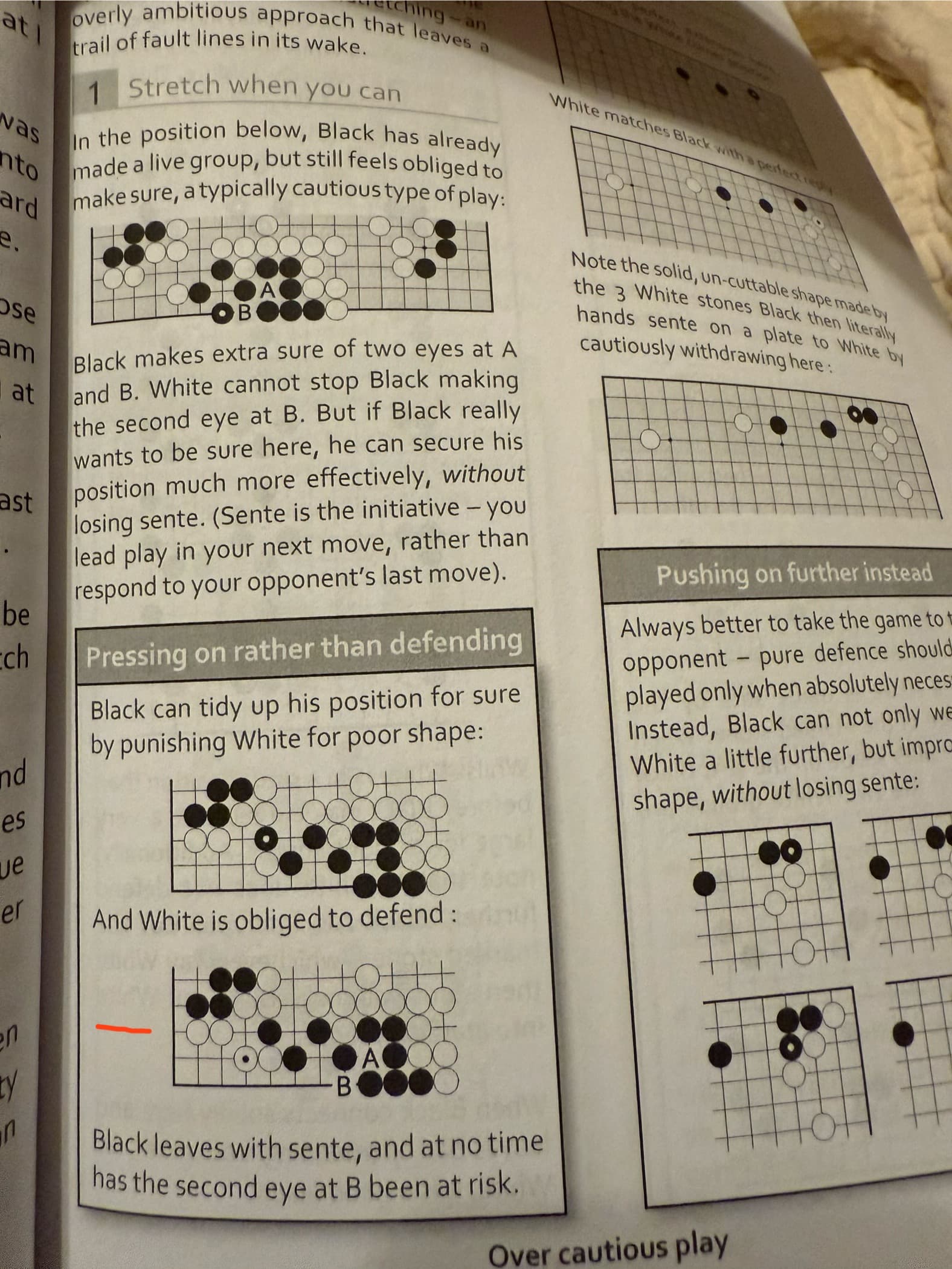 The reasoning of the book is strange: Black is aready alive so doesn’t need to add a move. But perhaps Black is a weak player so may want to add a move in sente to make sure. And Black knows that the move is sente because Black can read that the new position is already alive… However I don’t see why the new position is easier to read than the old one.