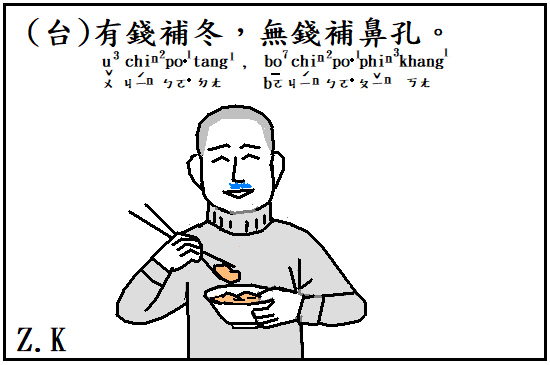 有錢補冬,無錢補鼻孔 (冬 and 孔 rhymes in Holo) - “(When someone) have the money (they) can eat well in winter; (when someone) have no money (they) can only eat/smell with (their) noses”