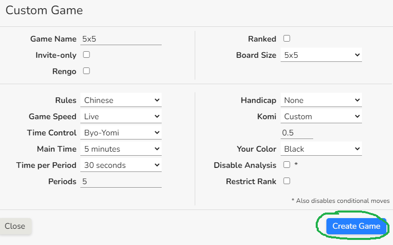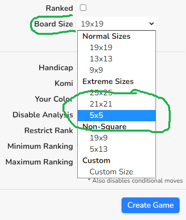 i have tried to get a 5x5 board started but it won’t let set up that smallest i can get is 9x9 so how do i play board i cannot find or create