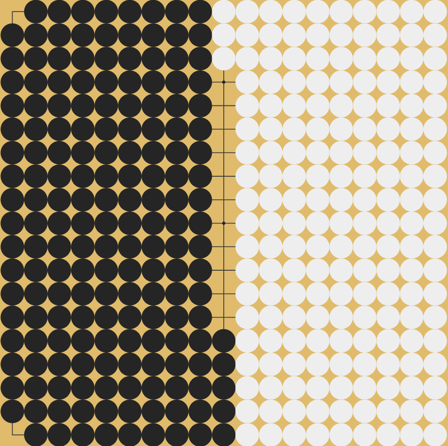 Letās just suppose the players take turns filling up the board like this, with no captures occurring. After 348 turns, they have each placed 174 stones on the board. Now, it is Blackās turn and they have no stones remaining: