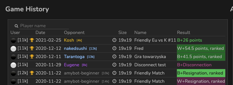 Hi! In my list of games on my profile page, there is a single Go stone to the far left of each game, indicating which color I played in that game. In light mode, there is an empty circle for white and a filled-in circle for black, which is correct. However, in dark mode, the “white” stone is still an empty circle (which makes it look dark) and the “black” stone is still a filled-in circle (which makes it look white).
