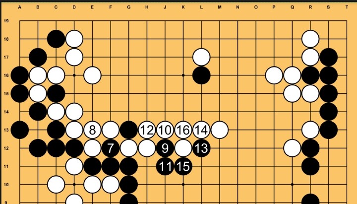 At the end of the variation, I think white doesn’t have to block at move 14 with L13, but just connects with K13. Black cann0t push into L13, because the K11 counter push. Along with the double cut at H8 and H6, a third cut point at L11 will pop up if black does block at K11 after the white K13 connect.