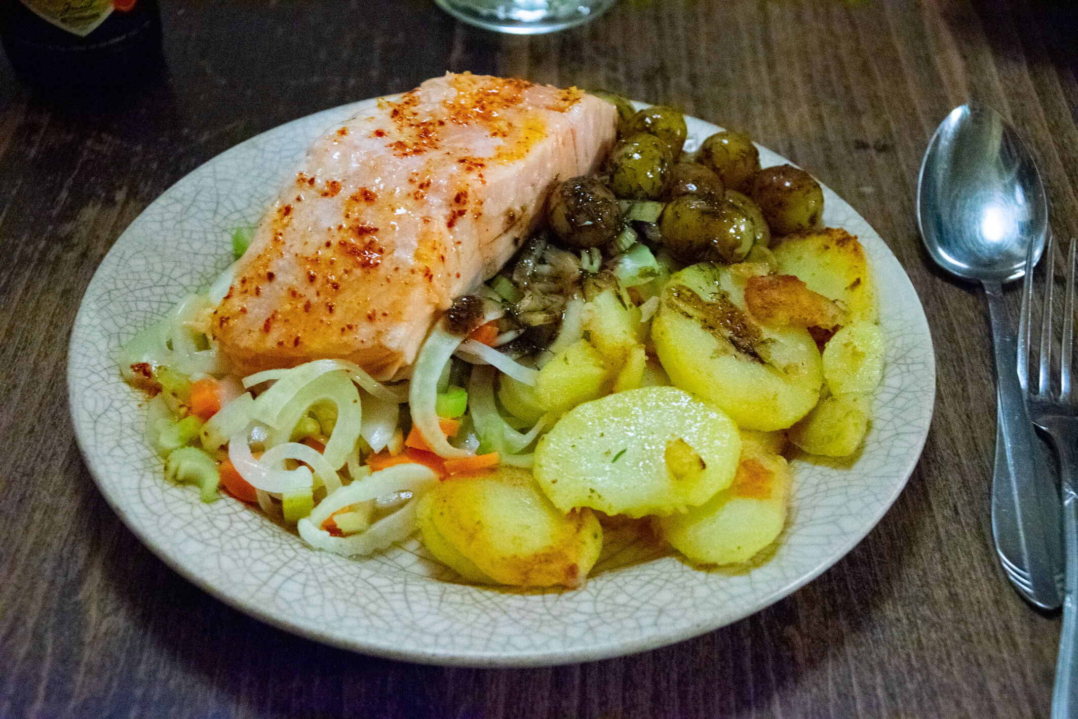 Tonight’s dinner was delicious. We made salmon en papillote, and I found this recipe where you’d put chili oil with lemon zest over it, and fried grapes (!) with balsemic vinegar, thyme and dill. It sounded weird, but it was absolutely delicious, will make salmon like this again!