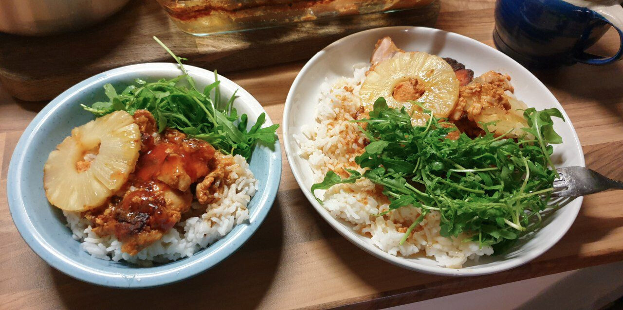 Sweet and sour chicken, rice, some random pineapple slice, and rucola