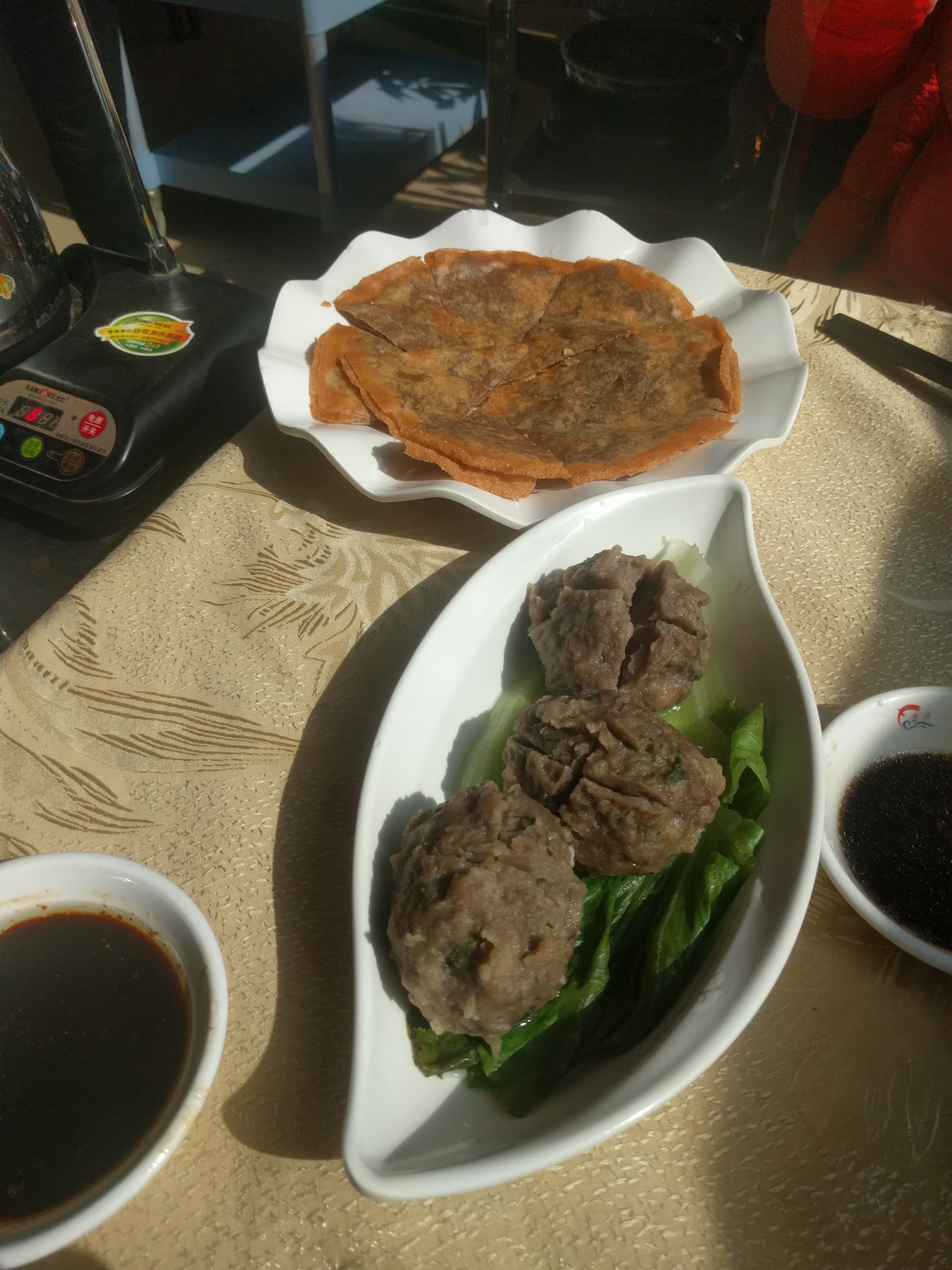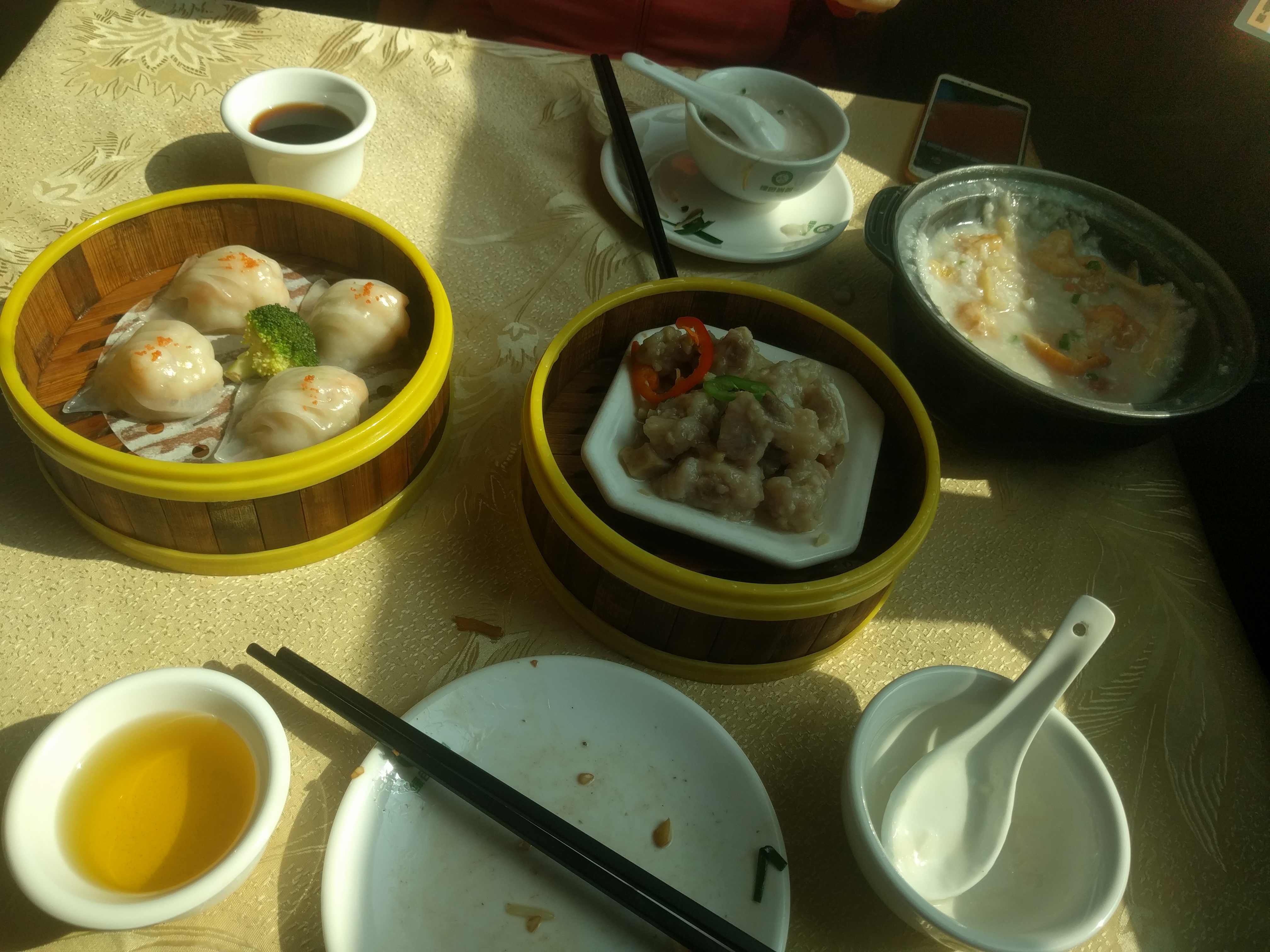 Pu’er tea, beef pancake and balls, little ribs, boat porridge, fried noodle, shrimp jiaoze… Still some coming, let see