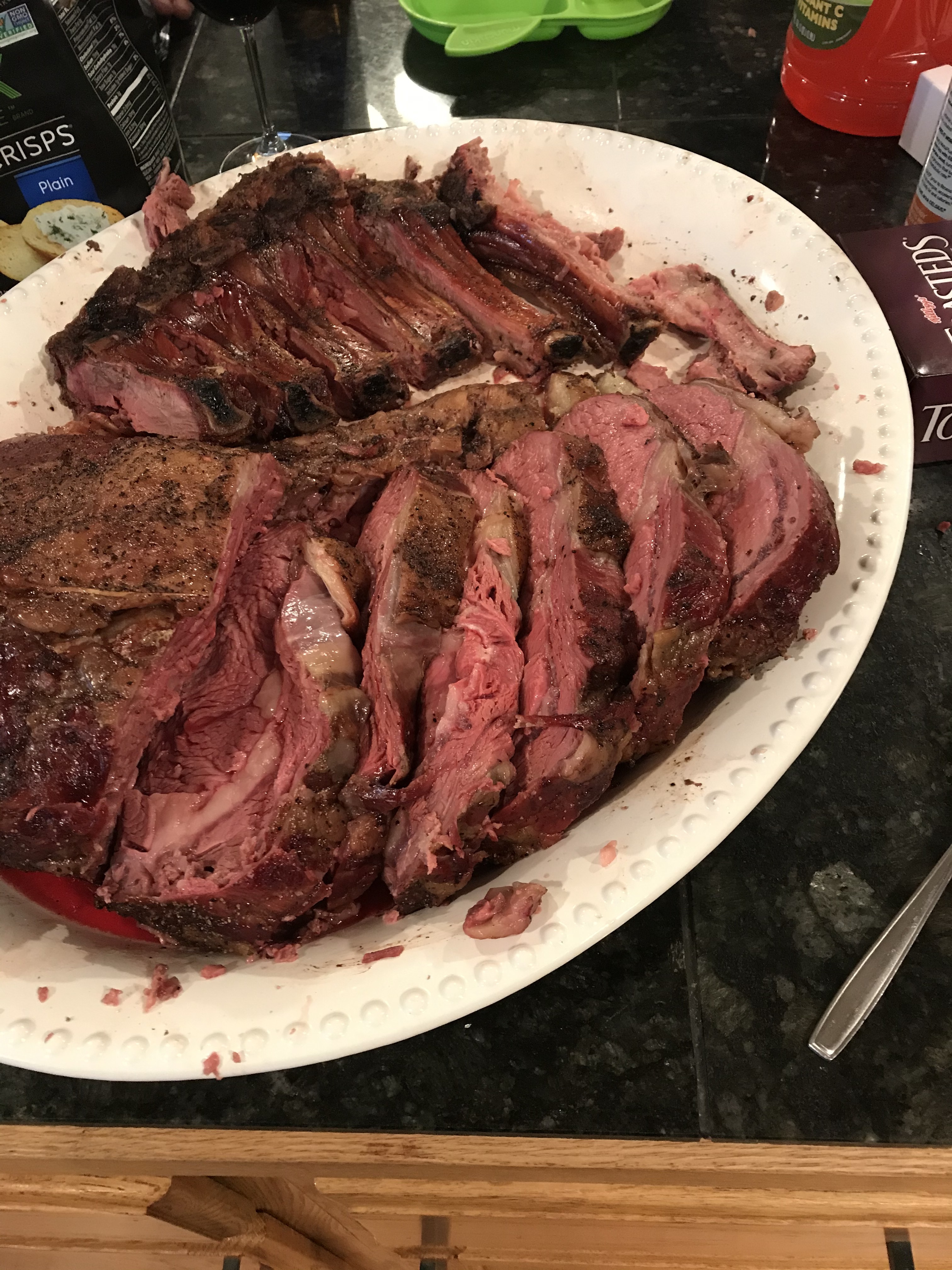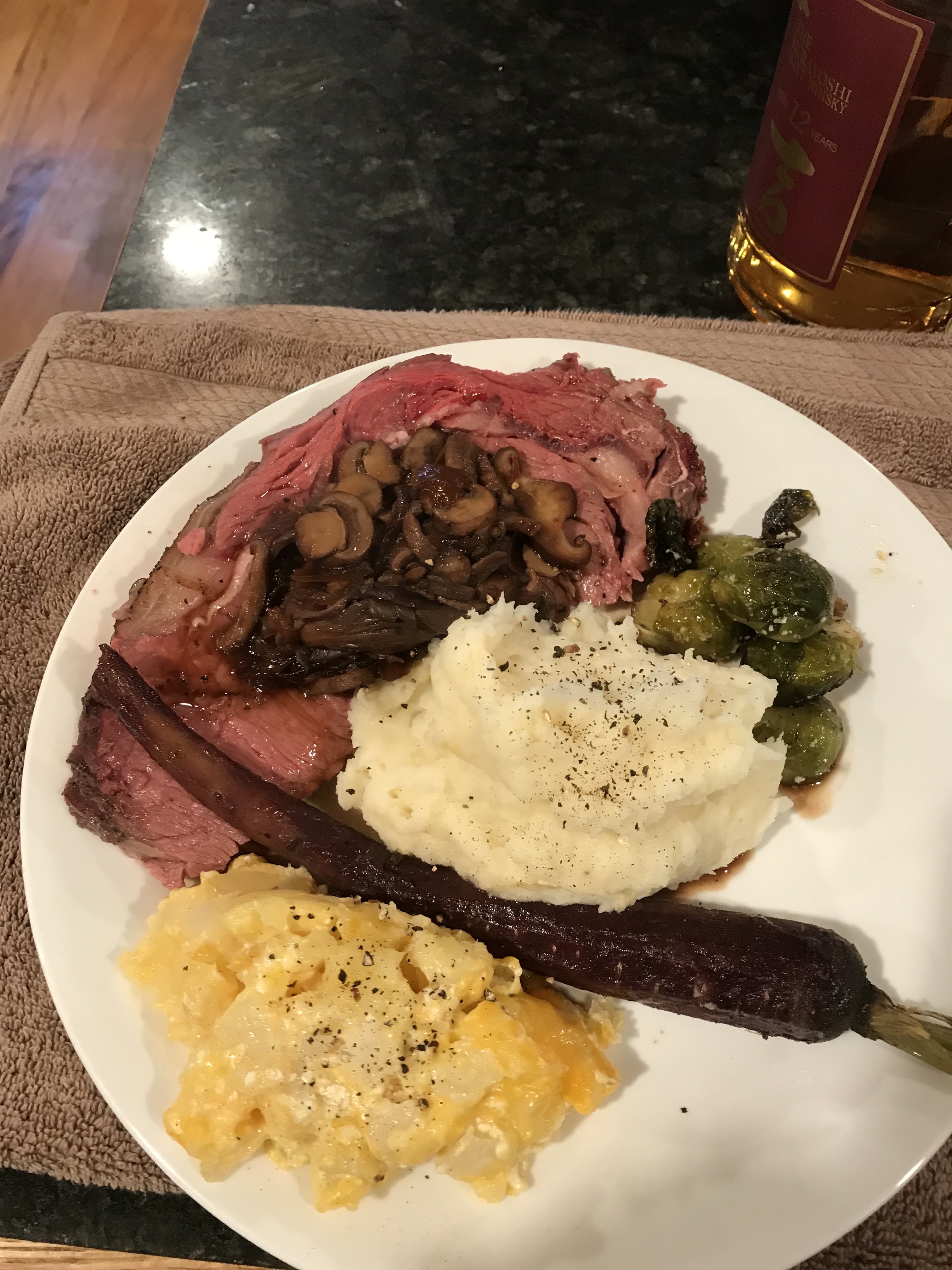 I also did a standing rib roast for Christmas. First time trying it smoked and it turned out pretty good. Also made cheesy potatoes, mashed potatoes, brussel sprouts, and carrots, also made some sauteed mushrooms and onions to go with the prime rib.