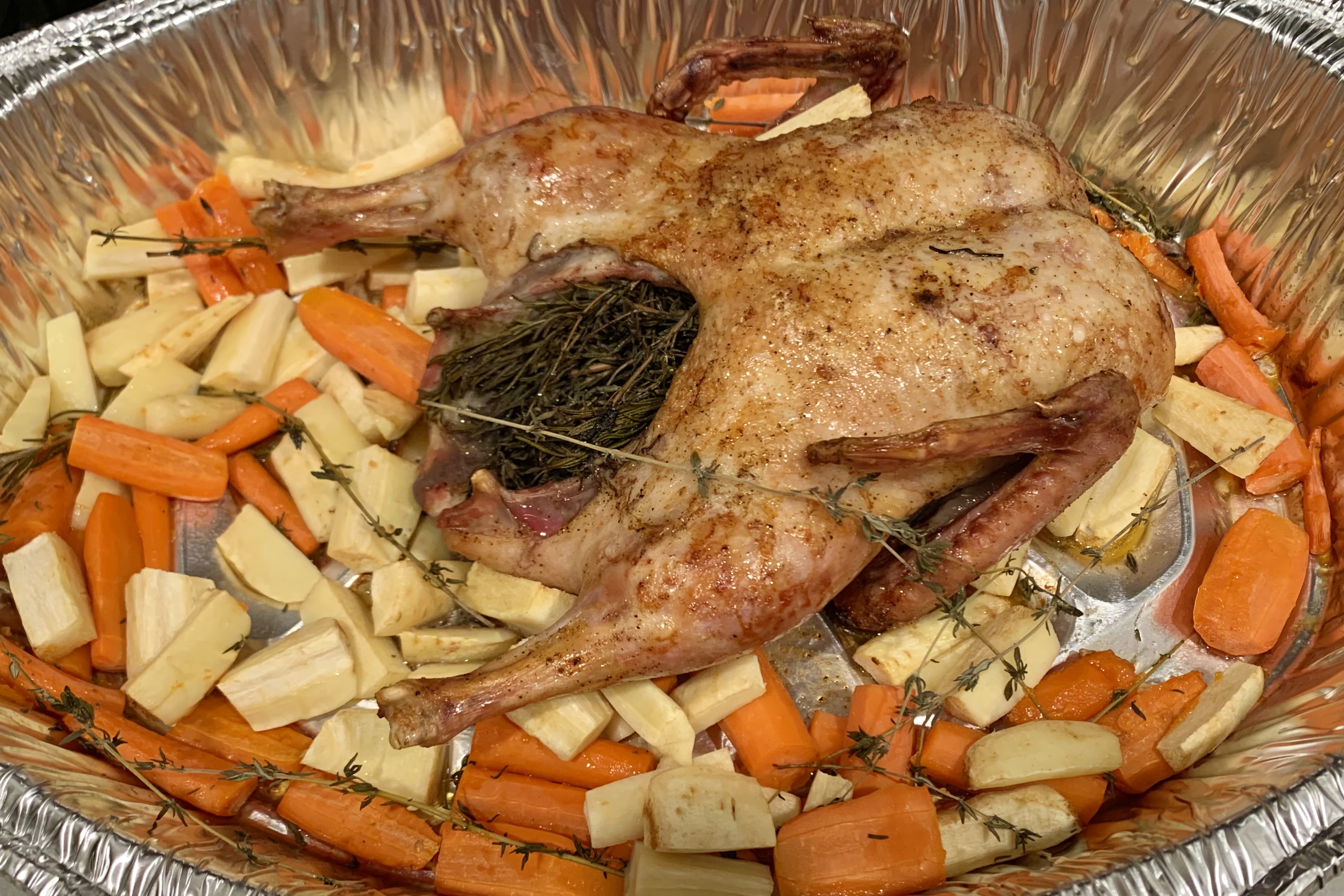 We had a Christmas duck made with leftover turkey rub. Stuffed its ass with grass. Haha. Carrots and parsnips added midway through cooking.