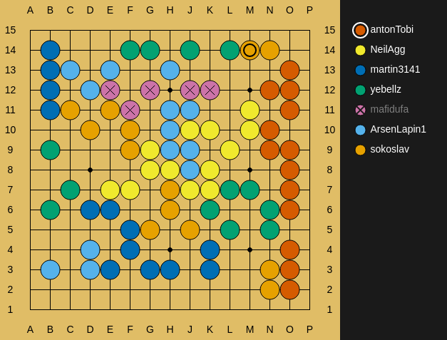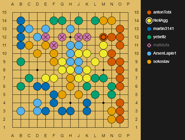 Orange develops their outpost with M14. @yebellz I hope you understand that this location is a kind of vital point for Orange: it brings the hope to have an eye here and be more independent from the neighbours. In another times this move could be considered aggresive (together with Cerulean playing H13) but Cerulean now has issues with other closest neighbours and all Orange needs is a breathing space.