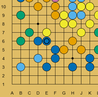Interestingly, the Gold group at F7 and the Orange group at H6 can build a seki if Gold plays at F6.