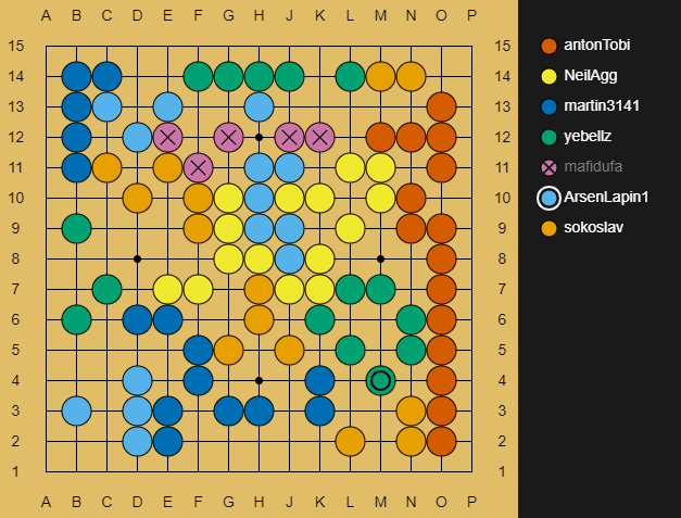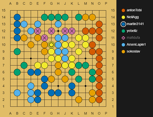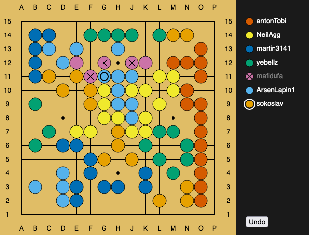 Red @antonTobi, earlier you said you would cooperate with us. In that vein, I kindly ask you not to play N11 so my stones have one open liberty in that space. Is that acceptable to you?