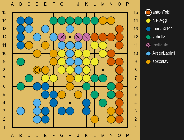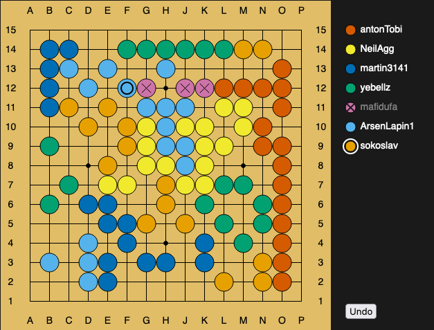 Funny. During the discussion with sokoslav I considered taking a screenshort of a future position where Orange had to play all the connection moves. This required me adding stones for the other players as well; and the next Red move I put on the board was indeed L13.