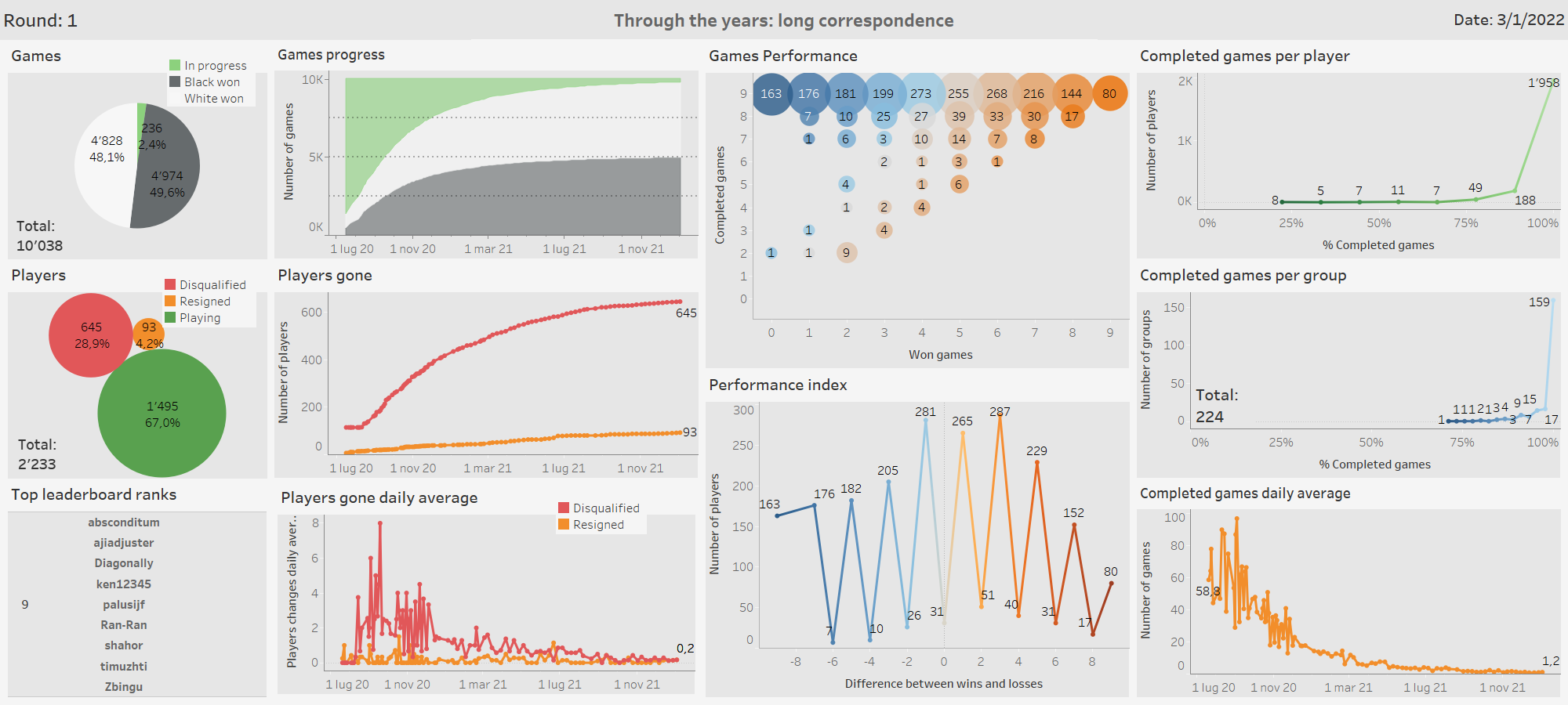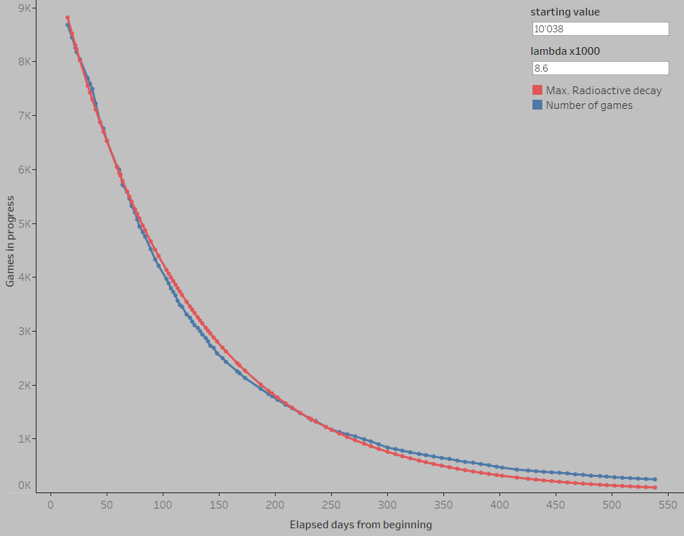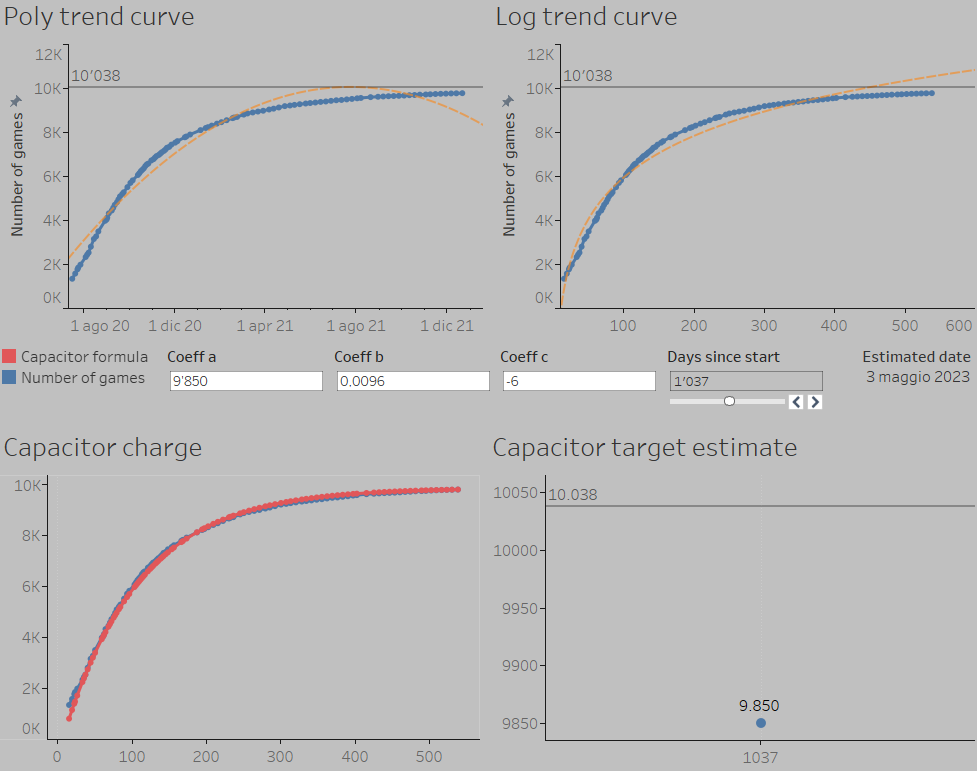 Best fit so far is the capacitor charging curve, which isn’t very reassuring: coeff a is the full capacitor charge. According to my curve, we’ll reach 9850 completed games next may and that’s it. If the comparison is correct, we won’t see the end of first round…