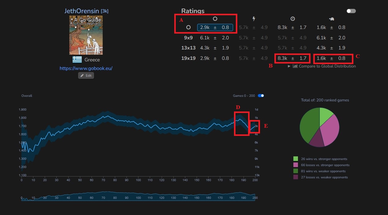 I recently joined the Irish league to improve/train a bit in smaller time settings, without realising that the games would be ranked and I wanted to try the square fuseki and sideseki, predictably I lost most of the games there and the result was the main rank falling from 2k to 4k (in box D), while my relevant time rank fell to 8k. (box B).