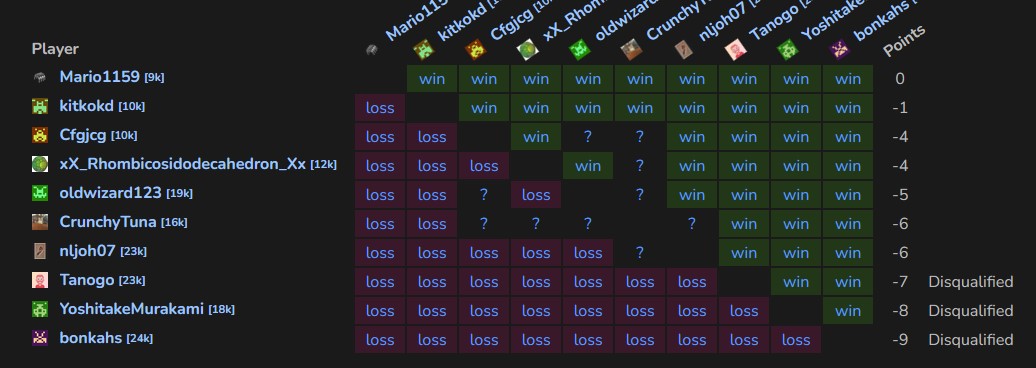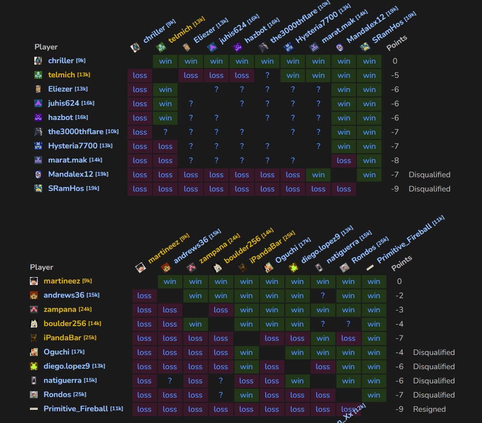 A similar thing has happened to a lot of the tables of the tournament, by the way, where there is a player in the bracket that has won all or almost all games. The most extreme cases are these though: