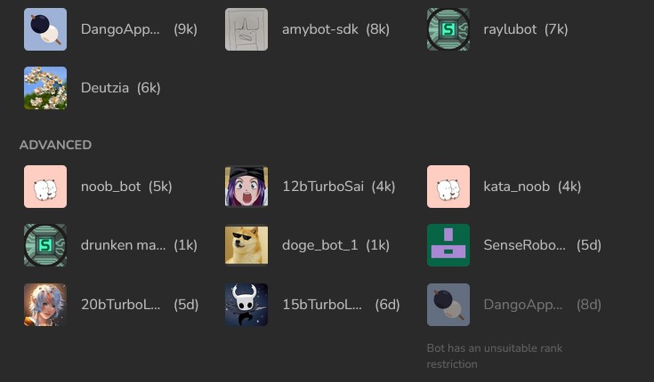 I was randomly thinking about the bot ranks yesterday before sleep and I came up with an idea that might help. Maybe this idea is already in place, but as far as I know currently: a) playing with a bot opponent is vague, since their rank is easily swayed and you cannot be certain that you picked the correct bot for your strength/rank and b) People might use bots to manipulate their rank.