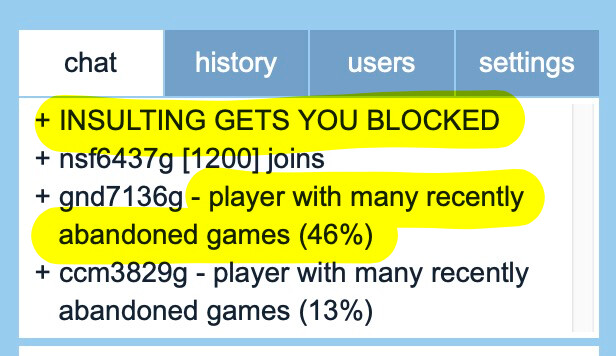 INSULTING GETS YOU BLOCKED on every chat feels a little heavy handed. I feel like users should agree to the TOS and be expected to respect them. (FWIW, I don’t run into a lot of mean players here. I feel like OGS’s existing systems are doing their job well)