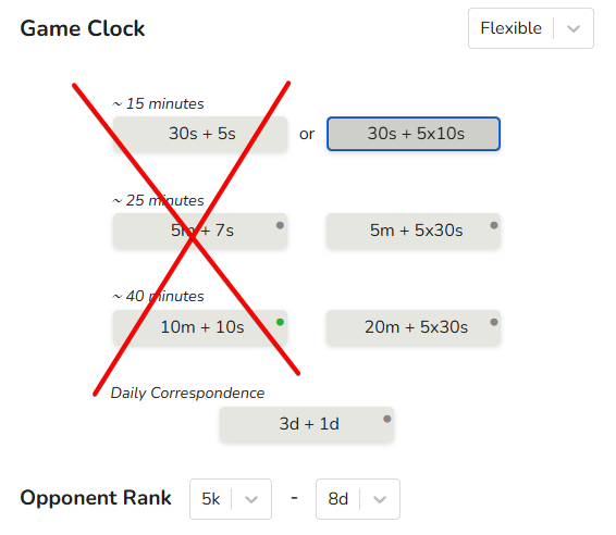 I 100% agree with @Regenwasser. These extra settings need to be removed from automatch. What exists currently is a half-assed effort to give automatch players half of the customizability of custom games. Why are there even Fischer time options? Most beginners don’t understand what that is, it can cause confusion in the UI, and some veterans like myself don’t even enjoy it. For example, 5m + 7s Fischer feels much slower than 5m + 5x30s byo-yomi to me, even if the total game lengths are similar.