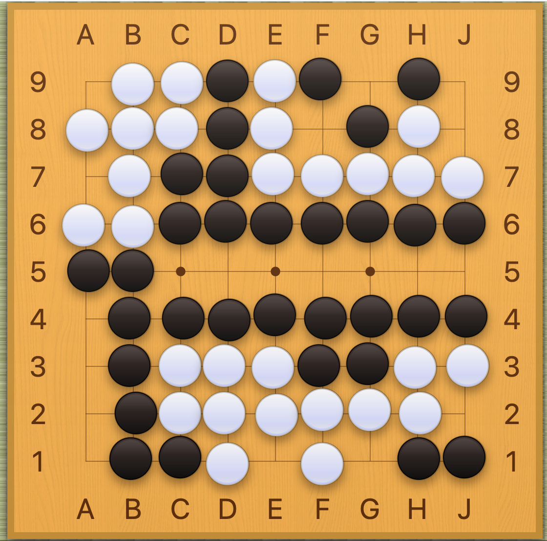 First let’s count prisoners, which we can’t see on the board. We notice that there are 16 White stones and 16 Black stones and White played last, so Black and White have the same number of prisoners.