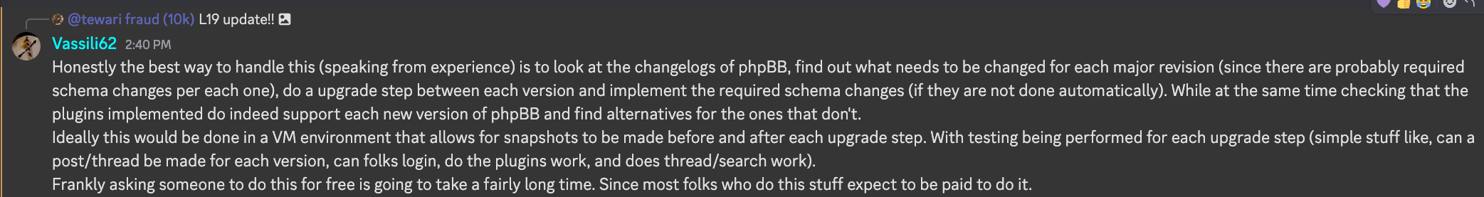 Like I mentioned to Thomas, no data is lost and I do take regular backups. It’s just a matter of getting the software through the upgrade lifecycle of over a decade’s worth of phpBB releases.