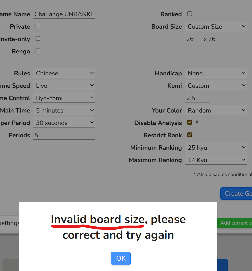 I also don’t know why the error message is so unclear when trying to make the width or height above 25, but for 1x1 the error is much more clear